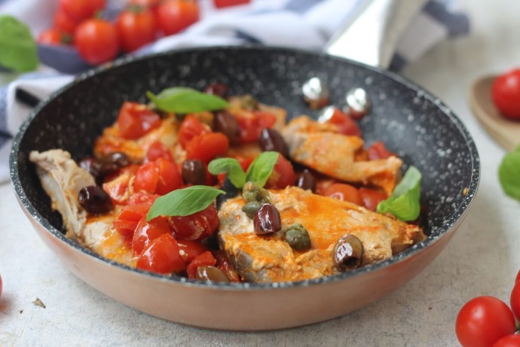 - Aggiunta degli altri ingredienti: aggiungi le olive e i capperi ai pomodorini in padella, mescolando delicatamente per amalgamare i sapori. Ora adagia i tranci di pesce spada, scottandoli per pochi minuti su entrambi i lati. Aggiungi solo un pizzico di sale, poiché capperi e olive sono già saporiti.